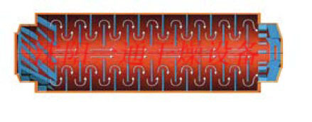 VDB 多通道螺旋干燥機(jī)由多項(xiàng)國(guó)際先進(jìn)技術(shù)構(gòu)成, 如高速風(fēng)切進(jìn)料裝置、分布式湍流器、循環(huán)渦流環(huán)管、螺旋多通道等,各通道均裝有特殊形狀的TSI導(dǎo)流板,物料在圓筒旋轉(zhuǎn)力及熱風(fēng)引力作用下沿螺旋導(dǎo)流道運(yùn)行,物料與熱介質(zhì)進(jìn)行充分質(zhì)熱交換。濕物料在入口段與高溫?zé)犸L(fēng)接觸,在高速風(fēng)切結(jié)構(gòu)作用下迅速分散,瞬間完成大部分水分蒸發(fā),物料含水率大幅降低,同時(shí)熱風(fēng)溫度急劇下降,然后物料進(jìn)入緩慢干燥段,干產(chǎn)品質(zhì)量高。入口高溫?zé)犸L(fēng)帶給物料的熱量均被水份蒸發(fā)所吸收,物料自身溫度始終保持在相應(yīng)的濕球溫度,物料水分不斷降低的同時(shí),熱風(fēng)溫度也相應(yīng)降低。而后,降溫的熱風(fēng)與物料順流通過(guò)各通道,使物料在低溫環(huán)境下完成剩余水分的蒸發(fā)過(guò)程。多通道結(jié)構(gòu)延長(zhǎng)了物料和熱風(fēng)在機(jī)內(nèi)停留時(shí)間,提高了熱能利用率,和干燥機(jī)的水分蒸發(fā)強(qiáng)度。