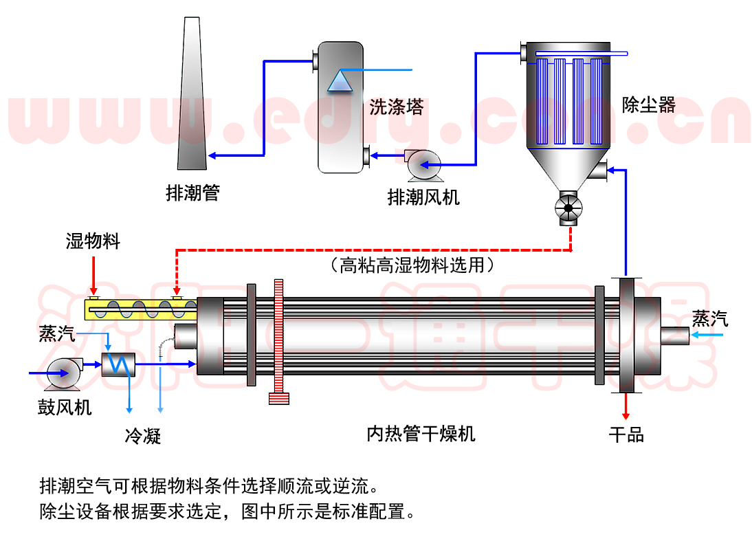 蒸汽等加熱介質(zhì)經(jīng)旋轉(zhuǎn)接頭進(jìn)入干燥機(jī),通過加熱管束間接與物料充分接觸,完成物料干燥。干燥機(jī)排出來的高溫潮氣可采用旋風(fēng)除塵、洗滌除塵、過濾除塵、消白設(shè)備等。