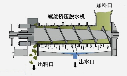 螺旋擠壓脫水機(jī)啟動(dòng)后,需脫水的高濕物料從進(jìn)料箱均勻加入,物料在螺旋旋轉(zhuǎn)葉片推動(dòng)下沿軸向向出料端移動(dòng),在變化的螺距、螺桿和調(diào)節(jié)擋板的巨大的擠壓力作用下,物料完成機(jī)械脫水作業(yè)。水分通過篩網(wǎng)在出水口排出,脫水后的物料在出料箱處排出。對于物料品種的不同和產(chǎn)量的變化可通過調(diào)整脫水機(jī)實(shí)現(xiàn),達(dá)到脫水效果和產(chǎn)量的最佳配合。