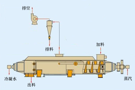 蒸汽等熱介質(zhì)通過安裝在回轉(zhuǎn)軸端部的旋轉(zhuǎn)接頭進入中空回轉(zhuǎn)軸和夾套,并通過空心軸進出槳片,蒸汽對流經(jīng)殼體夾套及空心攪拌軸,物料進行傳導傳熱干燥后,再通過旋轉(zhuǎn)接頭,將冷凝水排出機外,以保證最佳的傳熱效果。