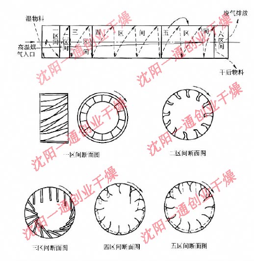 物料移動(dòng)到第五區(qū),進(jìn)一步被清掃裝置打碎,使其中的水分蒸發(fā)。當(dāng)物料進(jìn)入第六區(qū)間時(shí),即變成低水分的松散物料。