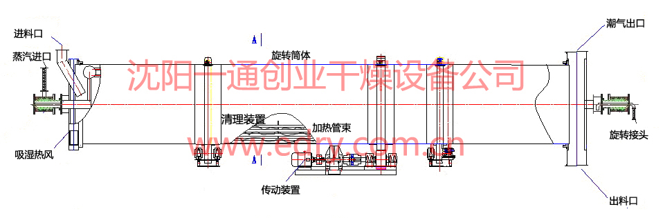 干燥機(jī)主要由筒體,蒸汽室、加熱管、抄板系統(tǒng)、清理裝置、傳動(dòng)系統(tǒng)、輪帶托輪系統(tǒng)、進(jìn)出料端密封和進(jìn)出料機(jī)構(gòu)等部件組成。干燥機(jī)內(nèi)進(jìn)料端設(shè)有防積料抄板,加熱管上設(shè)清掃裝置,避免物料粘結(jié)在加熱管上。
